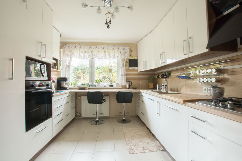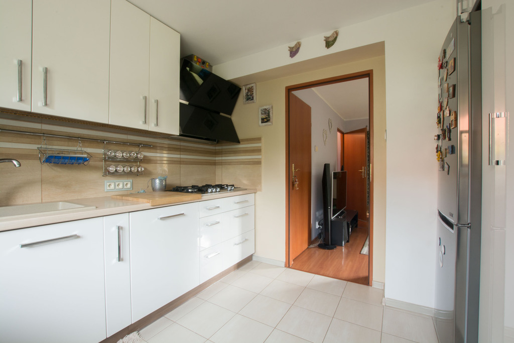 Ściany gładzone, wyrównane płytą GK, kuchnia z meblami na wymiar (zmywarka, okap, płyta grzewcza gazowa)