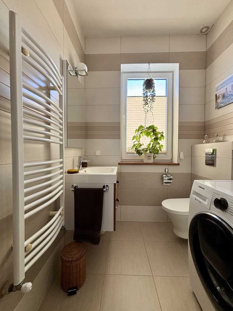 - Oddzielne (2,9m2) WC z miejscem na pralkę,