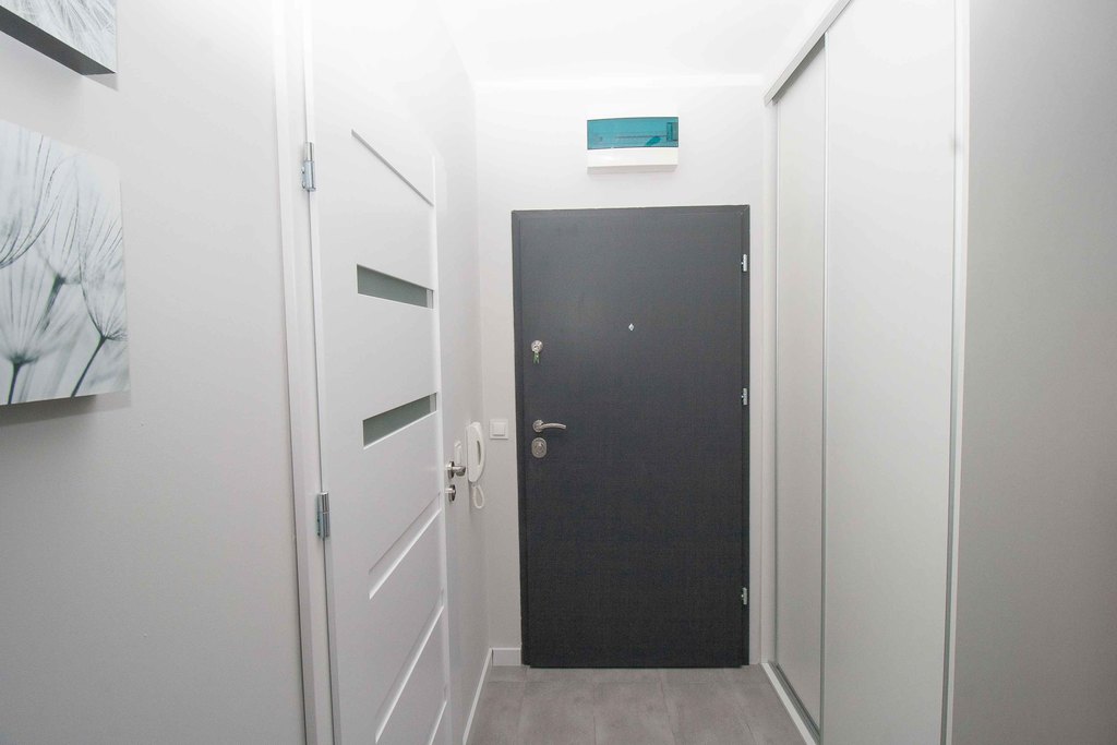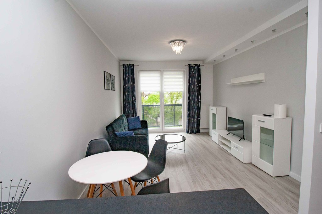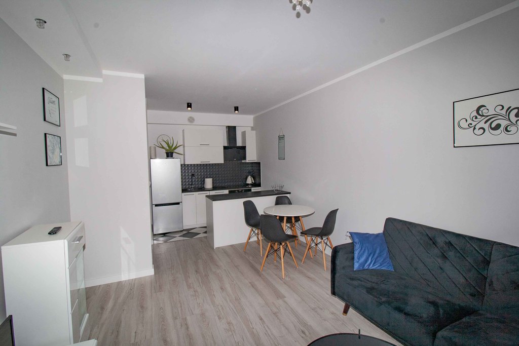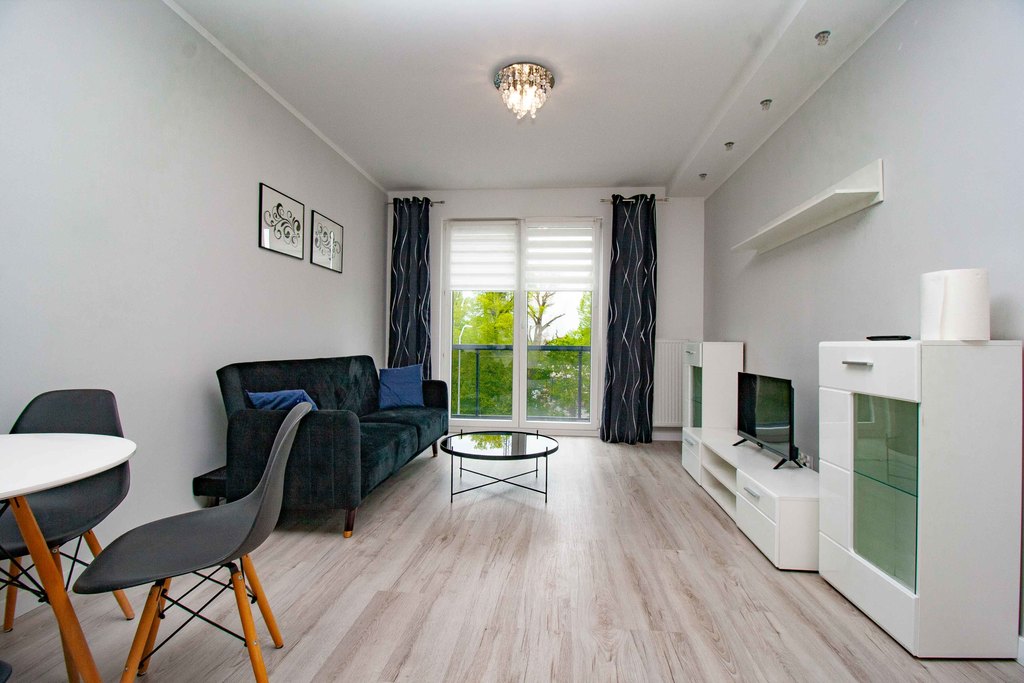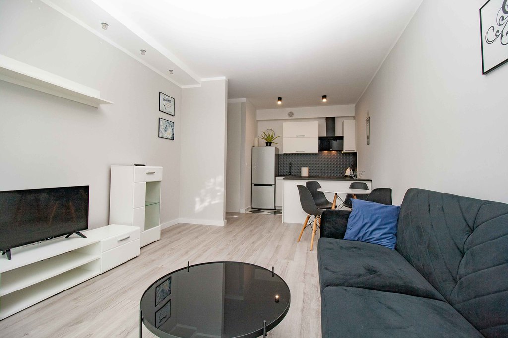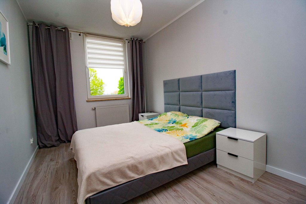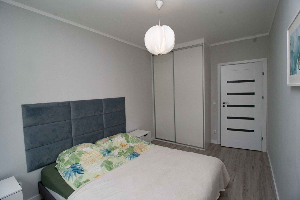 Beautiful, bright 2-room apartment with a balcony, new building from 2018 WITH ELEVATOR. in the Nowa Cukrownia estate. The apartment is freshly renovated, finished with high-quality materials: new floor panels, smooth walls and painted with good quality paint. The area of 42.86 m2 includes a living room with a kitchenette (21.88 m2), a bathroom (3.92 m2), a bedroom (12.4 m2) and large built-in wardrobes in the bedroom and hall.