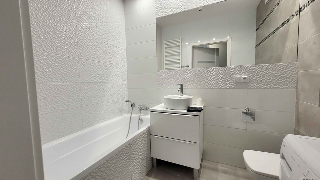 Mieszkanie jest świeżo po remoncie, wykończone materiałami wysokiej jakości: na podłodze nowe panele podłogowe, ściany gładzone, malowane dobrej jakości farbą.