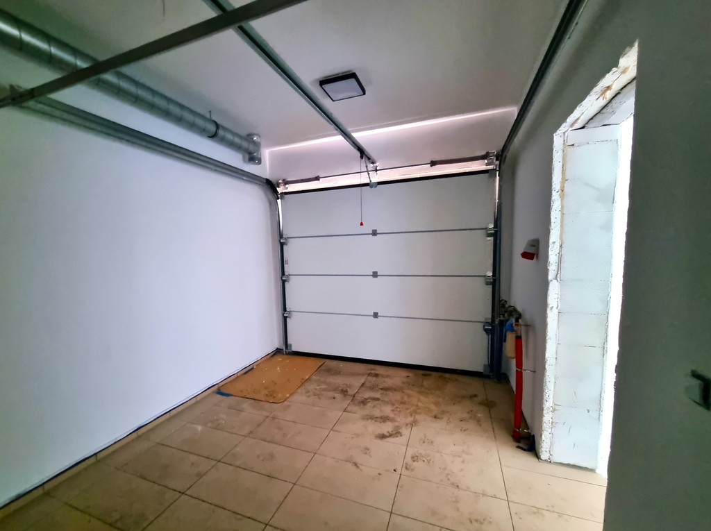 Garaż w bryle budynku z przejściem do przedpokoju, wykończony płytkami i cokołem wokół.