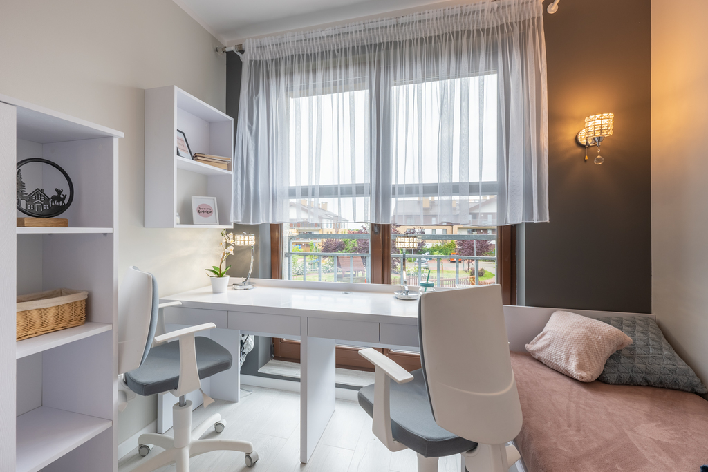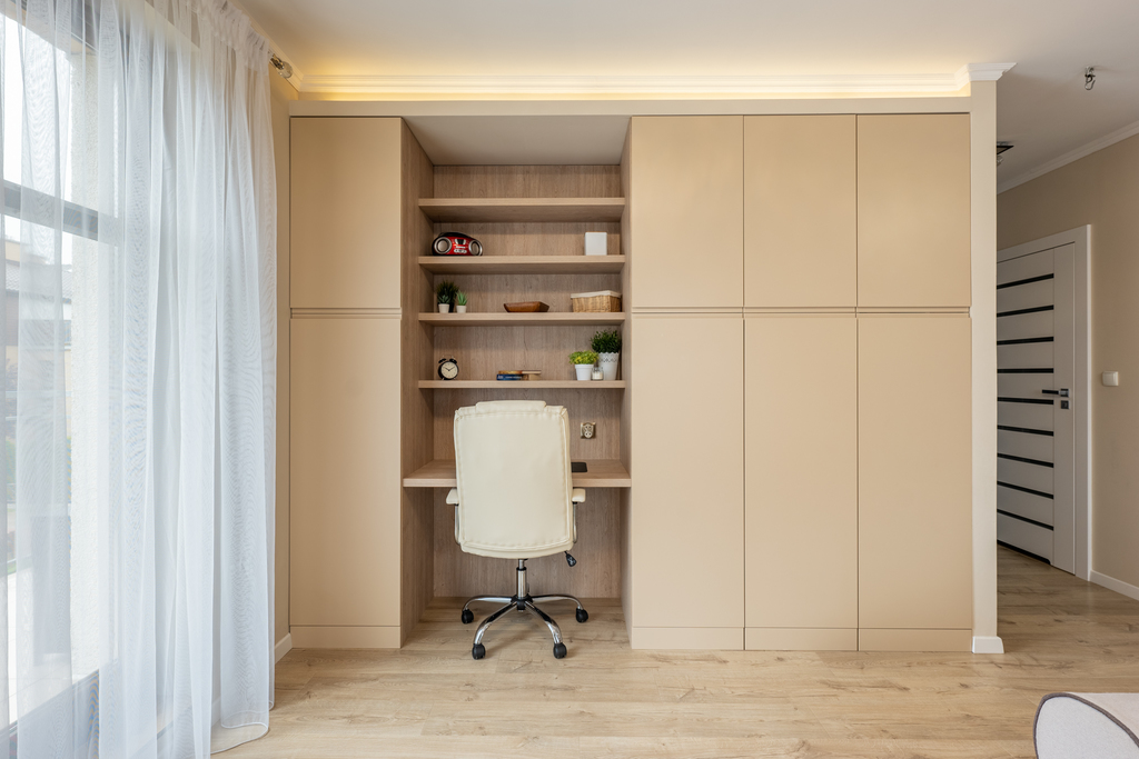 biurowej (biurko z krzesłem, półki, szafa w zabudowie na całą ścianę).