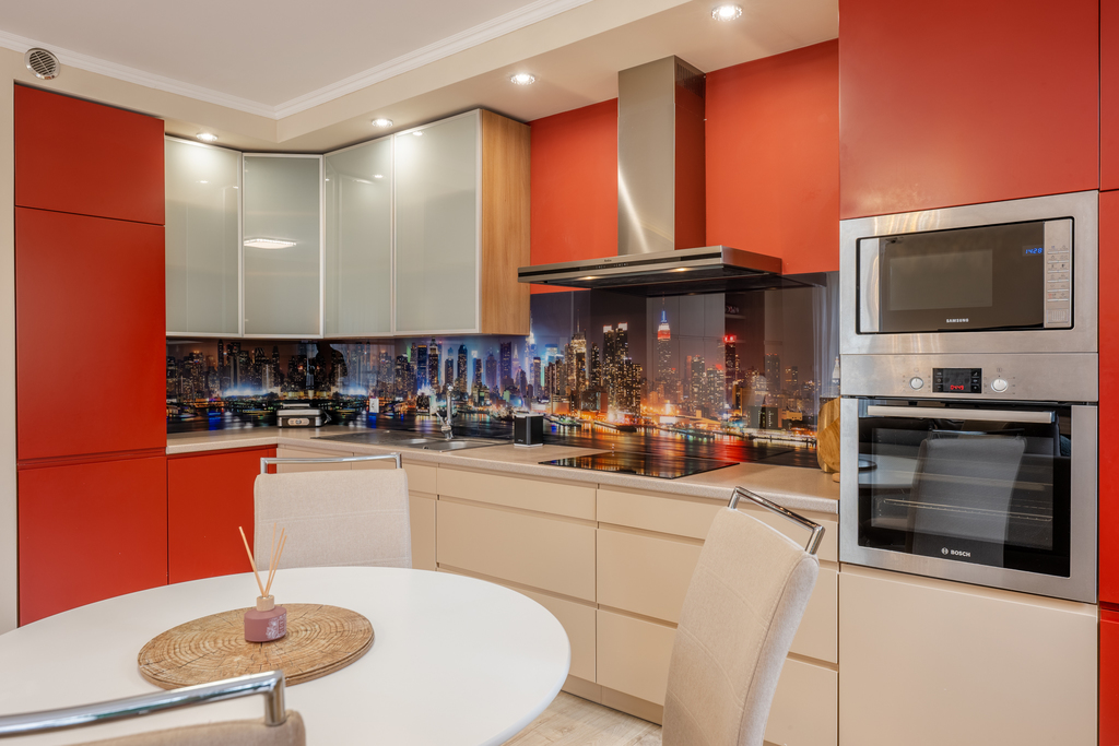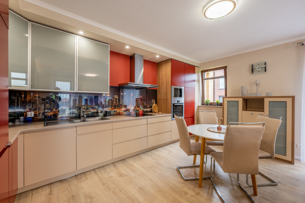 kuchennej (wyposażonej we wszelkie niezbędne sprzęty: kuchenka, piekarnik, okap, zmywarka, lodówko-zamrażarka, zlewozmywak, stół z miejscami do siedzenia, meble w zabudowie z dużą ilością miejsca do przechowywania rzeczy,