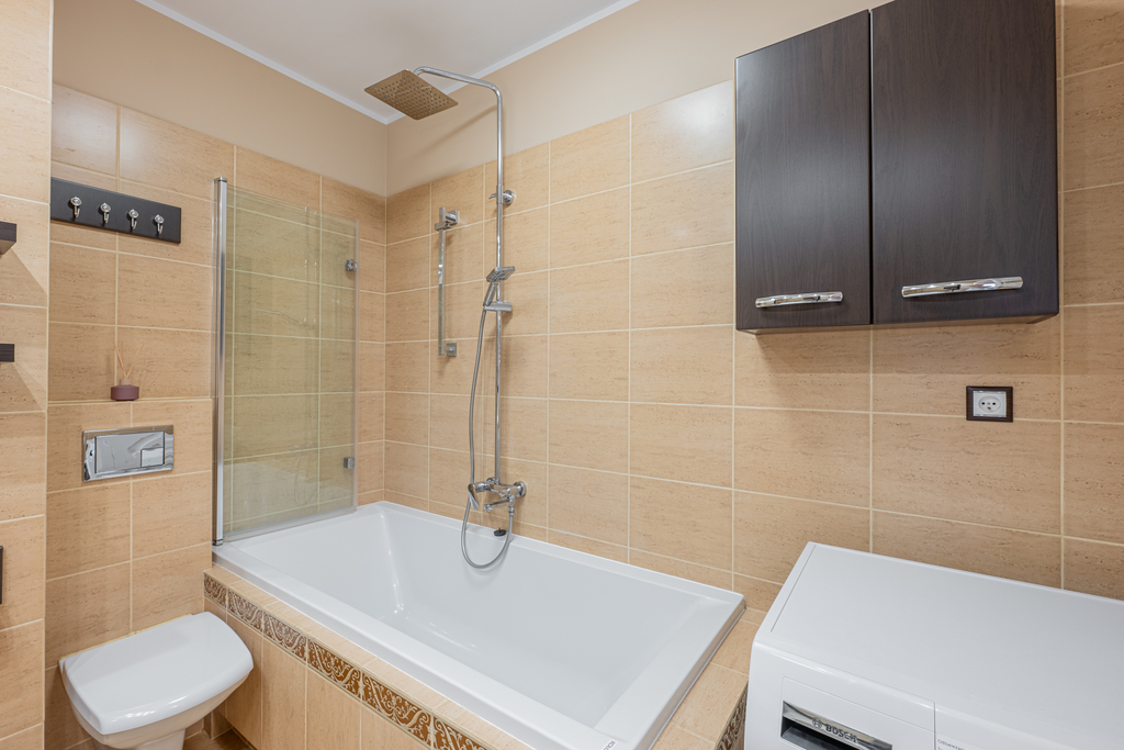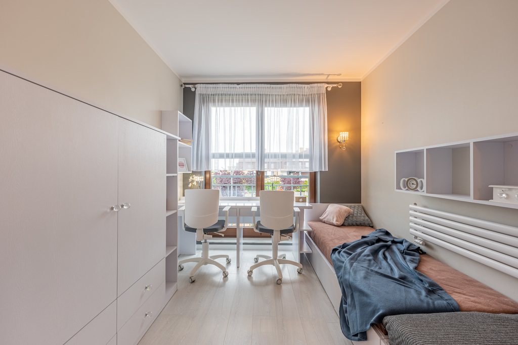 Z salonu mamy możliwość wyjścia na słoneczny balkon. W mieszkaniu mamy oddzielną łazienkę z WC oraz WC. W łazience duża wanna z funkcją kabiny prysznicowej, WC, pralka, obszerne lustro, szafki z dużą ilością miejsca. Mieszkanie posiada jeszcze 2 pokoje. W pierwszym mamy dużą szafę na całą ścianę, rozkładaną kanapę, komodę, regał oraz telewizor. Ostatnie pomieszczenie jest umeblowane dwoma łóżkami oraz dwoma biurkami wraz z krzesłami. W pomieszczeniu znajduje się duża szafa oraz regały. W przedpokoju wyposażony jest w przesuwną szafę wieszaki oraz szafkę. Do mieszkania przynależy miejsce postojowe w hali garażowej.