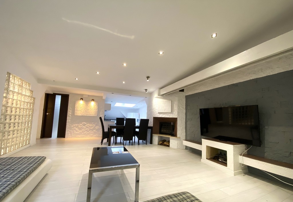 *spójna przestrzeń: przestronny salon z kominkiem połączony z otwartą, wyposażona kuchnia. W kuchni zamontowany wysokiej klasy filtr do wody!