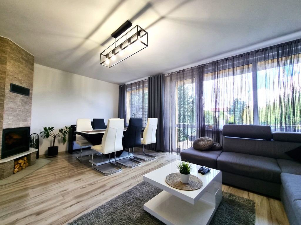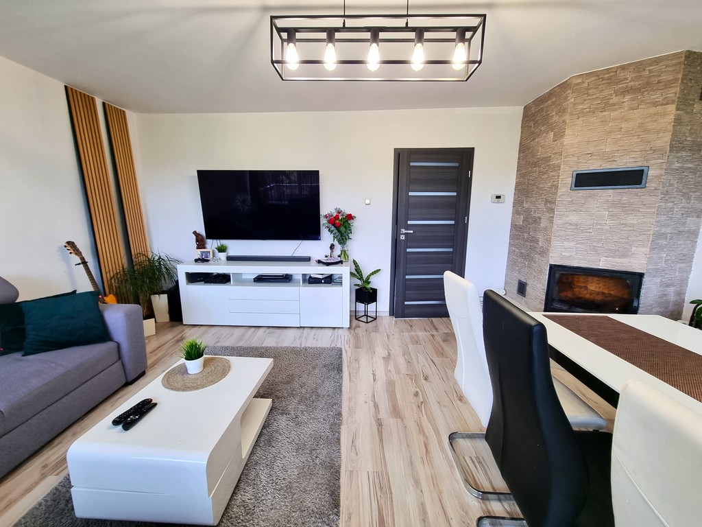 W salonie znajduje się kominek z płaszczem wodnym, którym alternatywnie można dogrzewać mieszkanie.