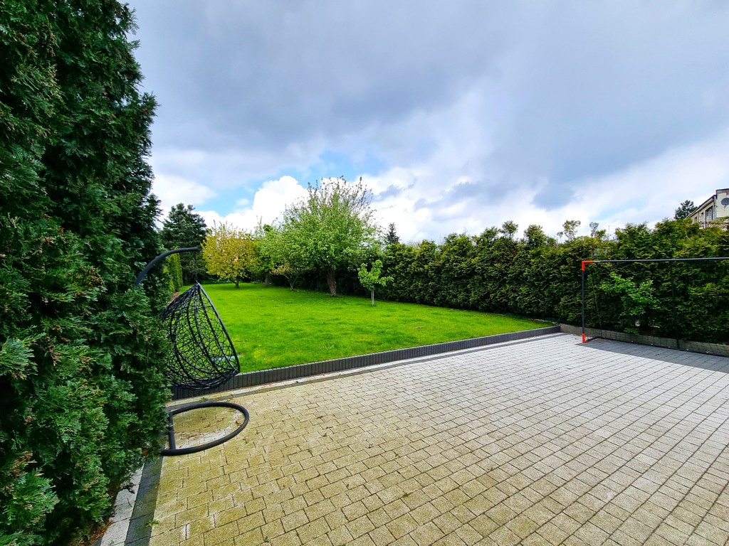 Ogród bardzo zadbany, liczne nasadzenia, zadbana trawa, automatyczny system nawadniania.