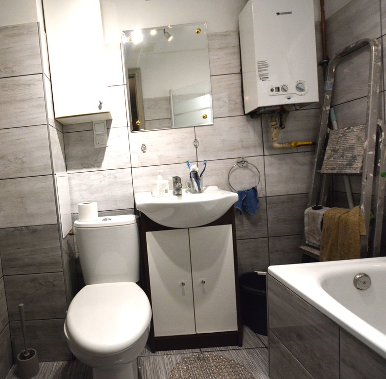 Łazienka w glazurze z WC, wanną i umywalką. Ogrzewanie miejskie. Bieżąca ciepła woda z pieca gazowego jednoobiegowego.