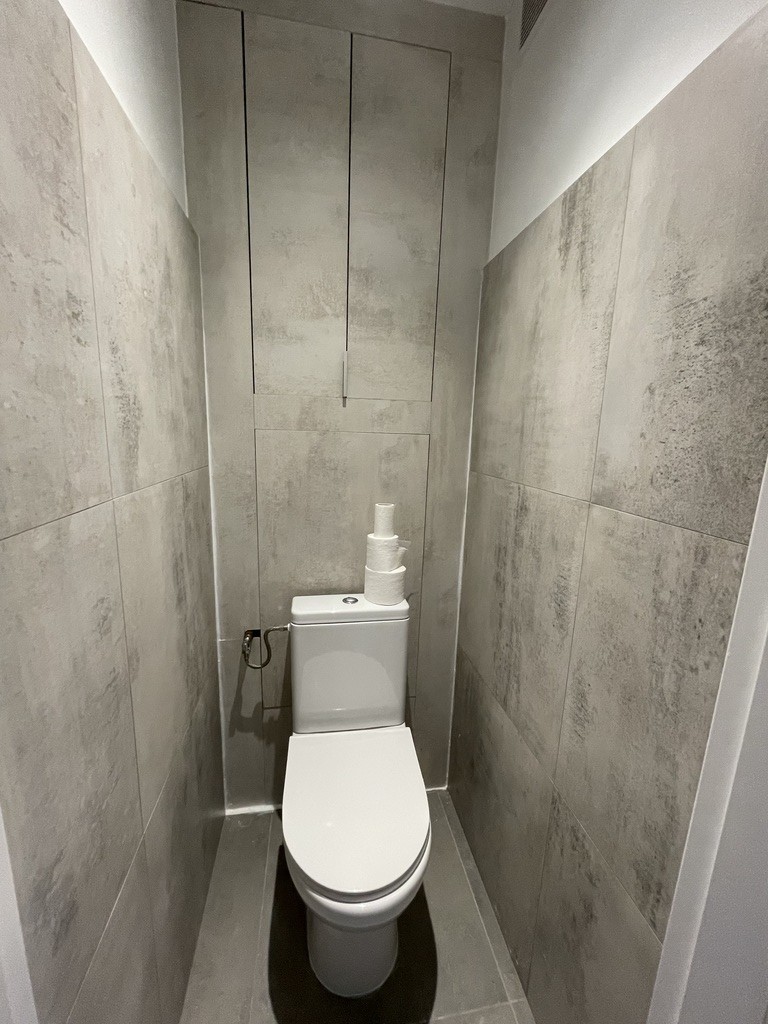 W łazience i wc (osobno) na podłogach i ścianach gres.