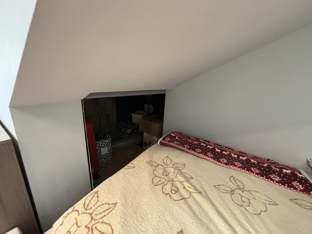 W pokoju na podłodze położone są panele, ściany są wygładzone i pomalowane, pod skośną ścianą znajduje się duży schowek.