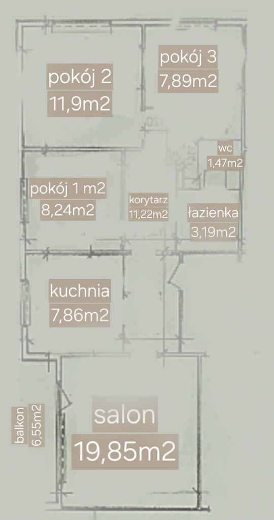 Mieszkanie składa się z dużego salonu z wyjściem na słoneczny balkon wyłożony płytkami, trzech osobnych sypialni, kuchni z oknem, osobno łazienki i toalety oraz przedpokoju.