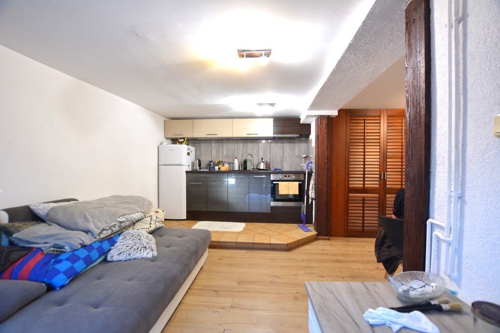 Poziom piwnicy; samodzielne mieszkanie z wejściem z przyziemia; salon z aneksem kuchennym, łazienka. Pierwotnie był garaż, możliwe przywrócenie stanu poprzedniego.