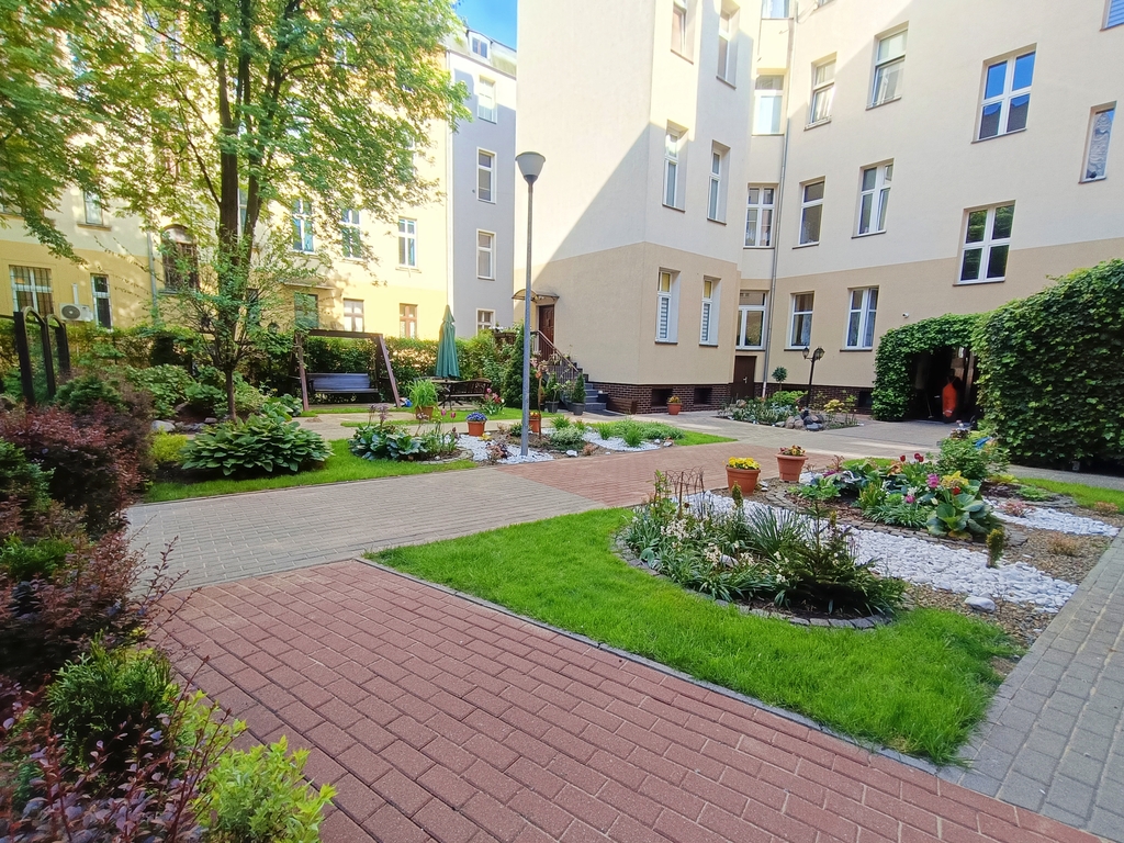 Prężnie działającą wspolnota stworzyła piękny ogród na dziedzińcu, dodatkowo wiata na rowery oraz miejsce spotkań dla dzieci .