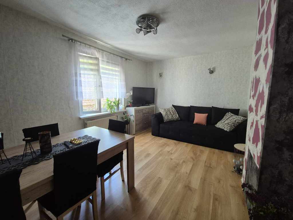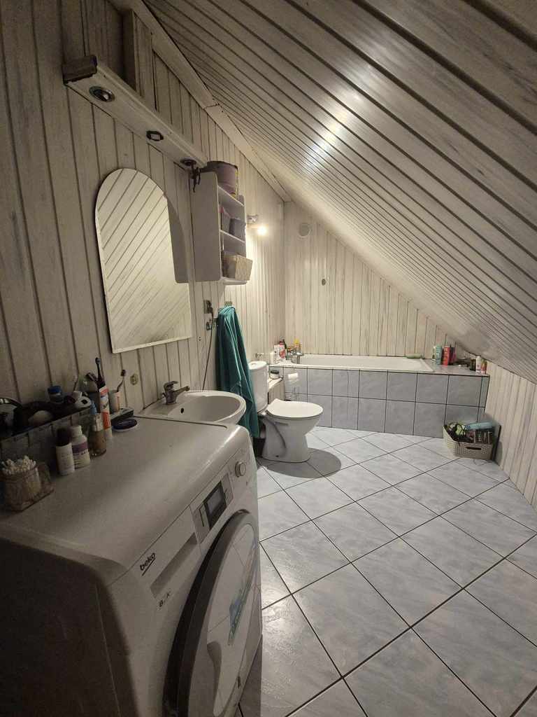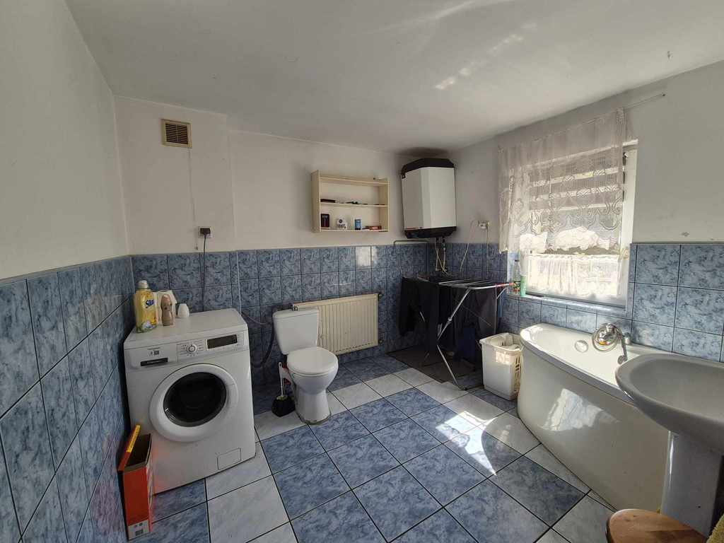 Pierwsza kondygnacja domu to: duża kuchnia, 2 sypialnie, pokój dzienny oraz łazienka z wc w glazurze i terakocie. Wszystkie pomieszczenia z oknami pcv, na podłogach w pokojach panele .