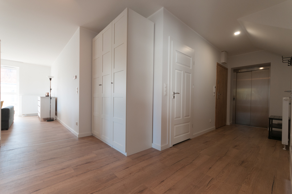 Apartament do którego wjeżdża się bezpośrednio windą z parteru lub z poziomu hali garażowej. Dostępne jest podwójne miejsce w hali garażowej za kwotę 600zł miesięcznie.
