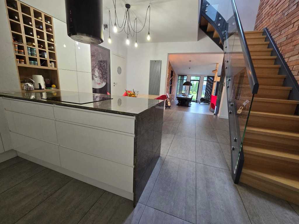 Kuchnia urządzona w wysokiej klasy sprzęty oraz rozdrabniarkę, zapewniającą wygodę i funkcjonalność.