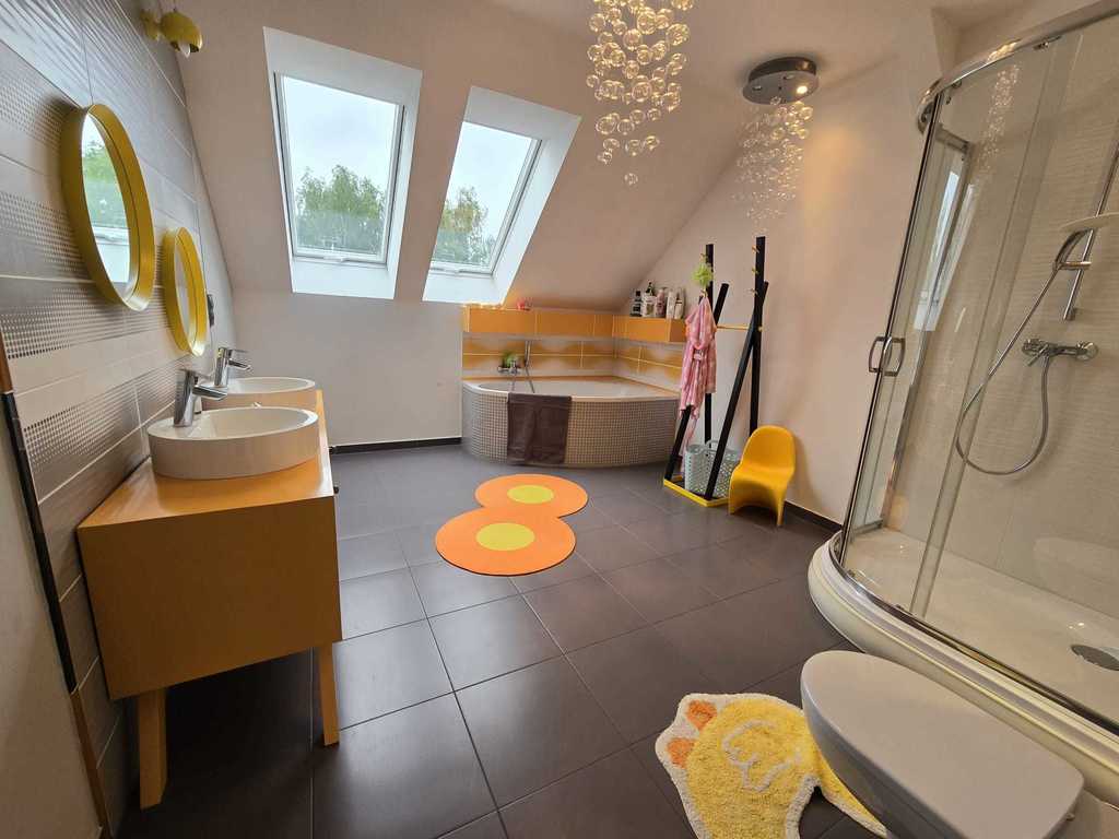 Salon oraz 4 pokoje, 2 kuchnie i 4 łazienki, zapewniające wygodę i funkcjonalność dla mieszkańców.