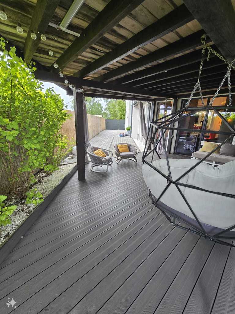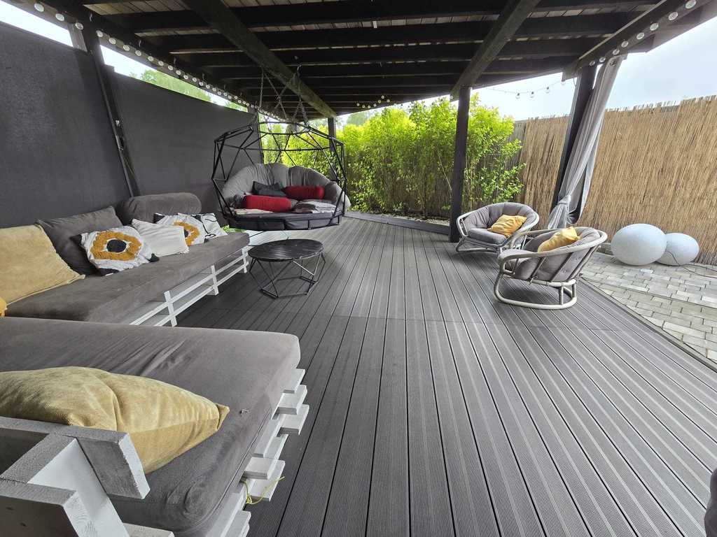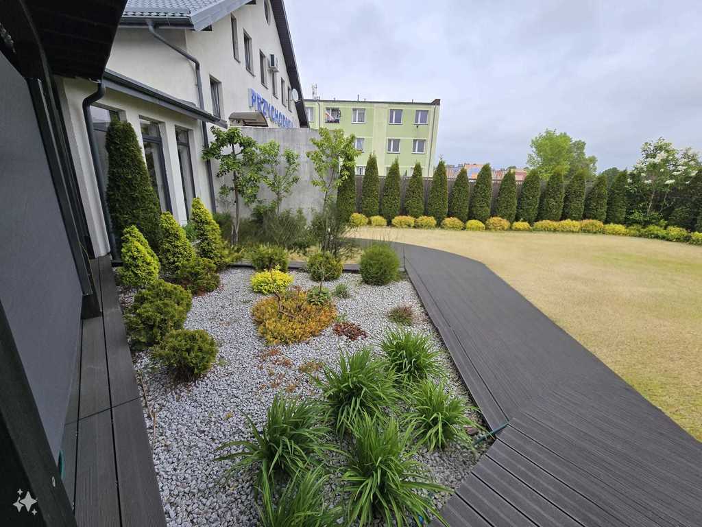 Duży ogród z pięknym tarasem i urokliwymi nasadzeniami, idealny na relaks i spotkania na świeżym powietrzu.