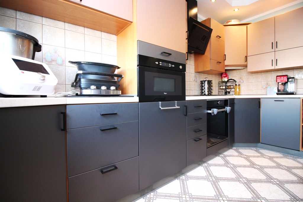 - kuchnia w zabudowie na wymiar, wykonana materiałami bardzo dobrej jakości wraz ze sprzętami AGD:  kuchenka elektryczna, płyta indukcyjna, okap, mikrofalówka, lodówka, zmywarka.