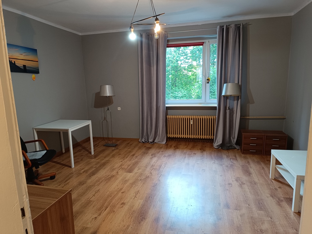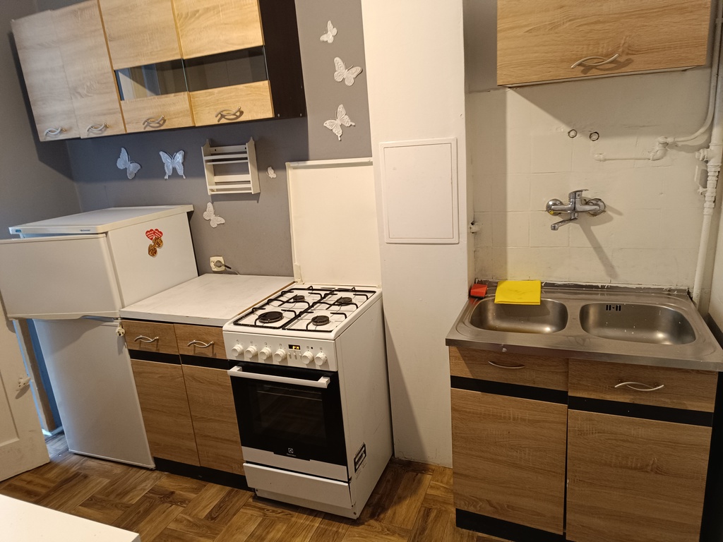 Mieszkanie jest rozkładowe i składa się z dużego pokoju, kuchni z loggią, łazienki z wanną i przedpokoju.