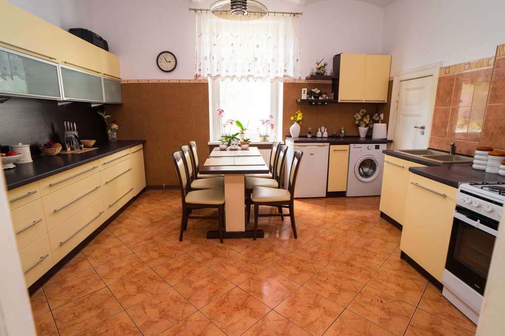 W kuchni, łazience i WC, na podłogach jest terakota, a na ścianach glazura. Kuchnia jest połączona z jadalnią w otwartej formie.