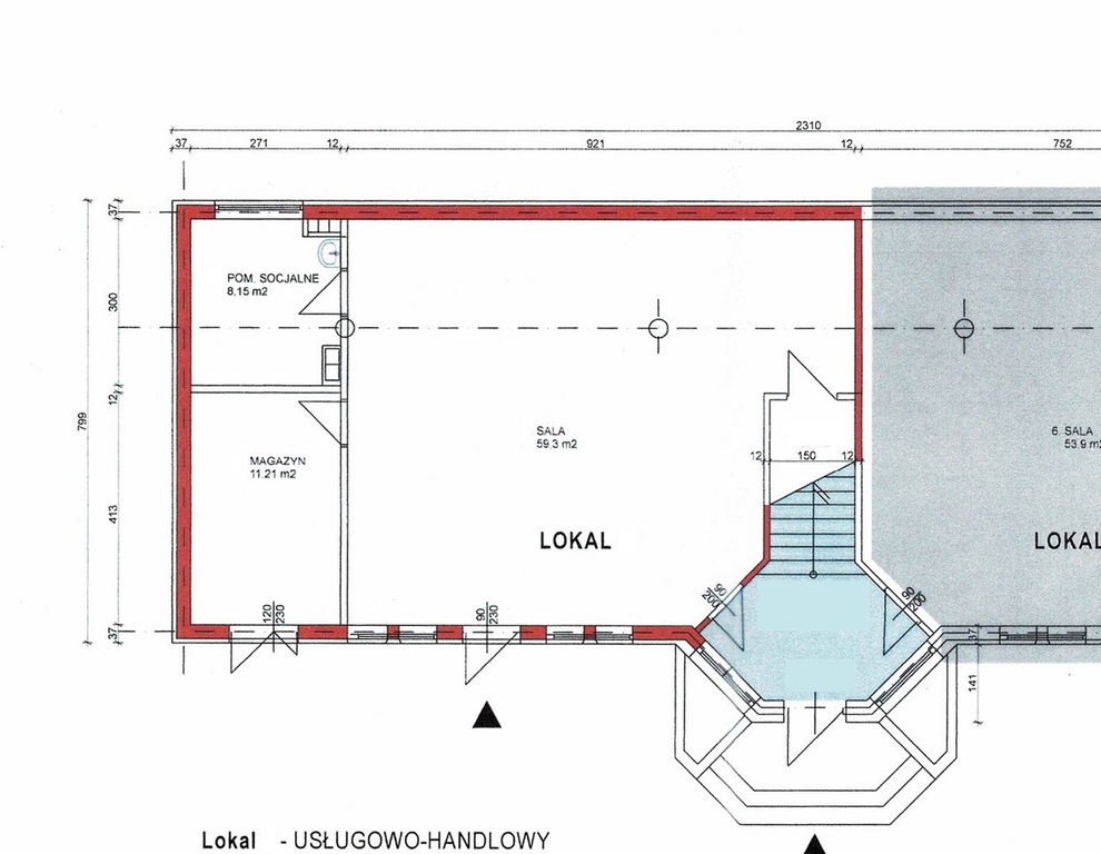 - Sali sprzedaży o powierzchni 59,3 m2, ściany gładzone pomalowane, na podłodze terakota.