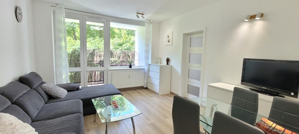 W pełni wyposażone i umeblowane, 3 pokojowe mieszkanie z balkonem, położone na parterze niskiego bloku w sąsiedztwie Parku Żeromskiego oraz C.H. Galaxy.