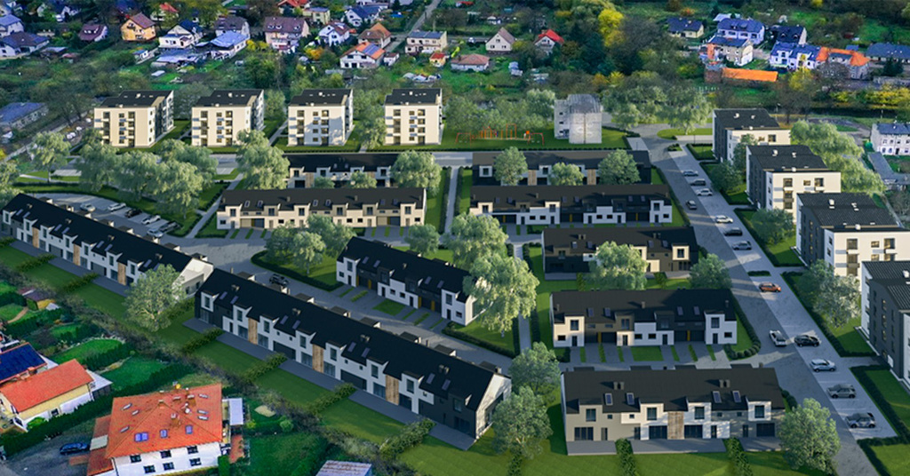 Nowoczesne osiedle, które stanowi harmonijną mieszankę budynków mieszkalnych wielorodzinnych i przytulnych domów szeregowych.