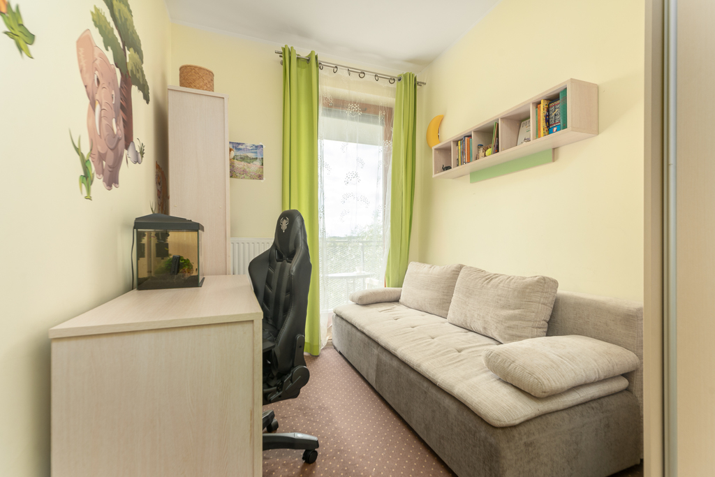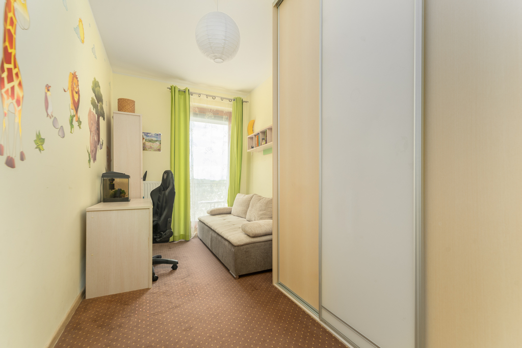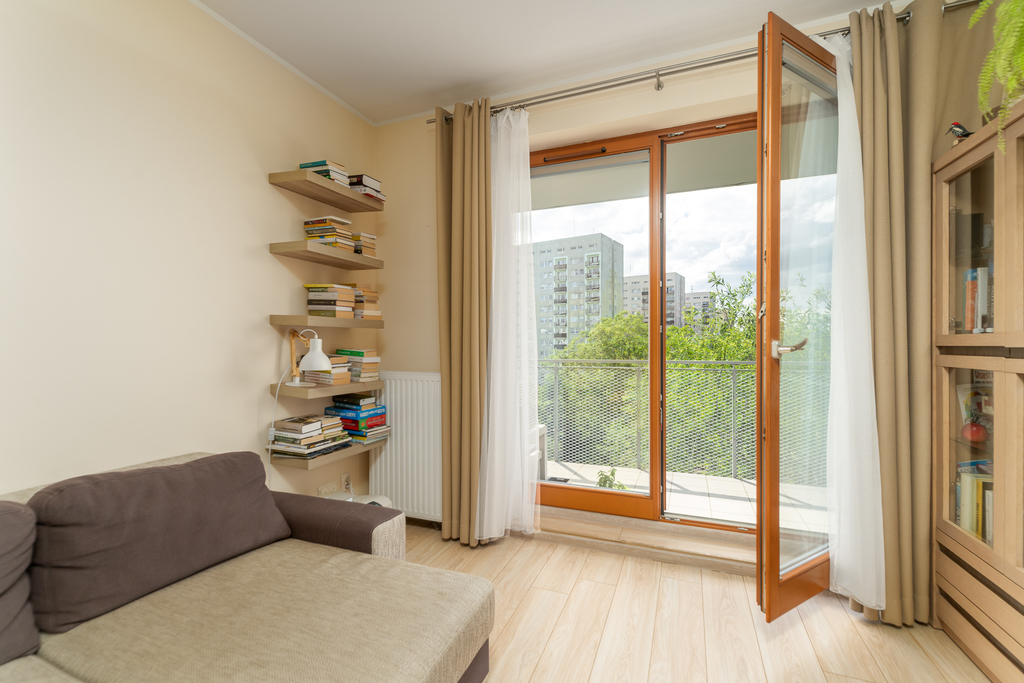 Mieszkanie jest ciche, ciepłe i słoneczne, znakomicie usytuowane, ekspozycja – wszystkie pokoje okna na zachód z widokiem na części zielone sąsiadujących ogrodów ROD, a z balkonu także na panoramę miasta, z pokoju dziennego i z kuchni dodatkowe okna na część wewnętrzną osiedla, z pięknie utrzymanymi skwerami.
