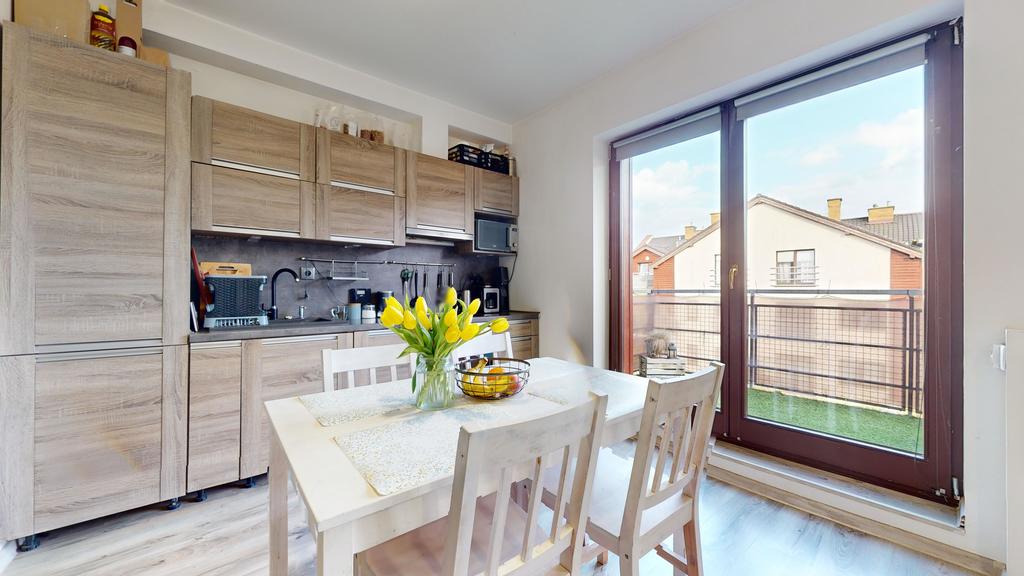 - przestronnego salonu z aneksem kuchennym, z którego jest wyjście na duży balkon,
