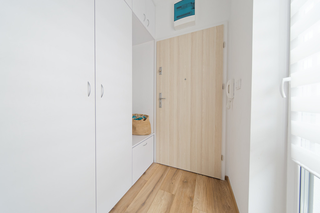 Przedpokój również wyposażony jest w dużą szafę wykonaną przez stolarza na wymiar.