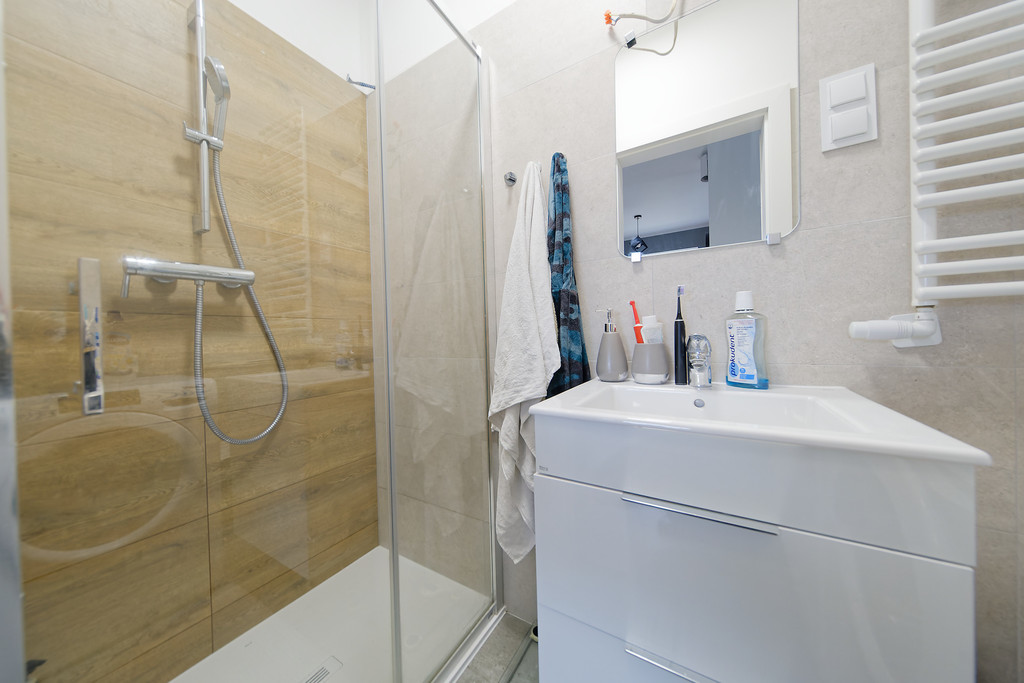 Łazienka wyposażona jest w kabinę prysznicową, szafkę z umywalką oraz wysokiej jakości armaturę marki Roca i Hansgrohe.