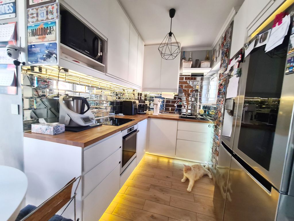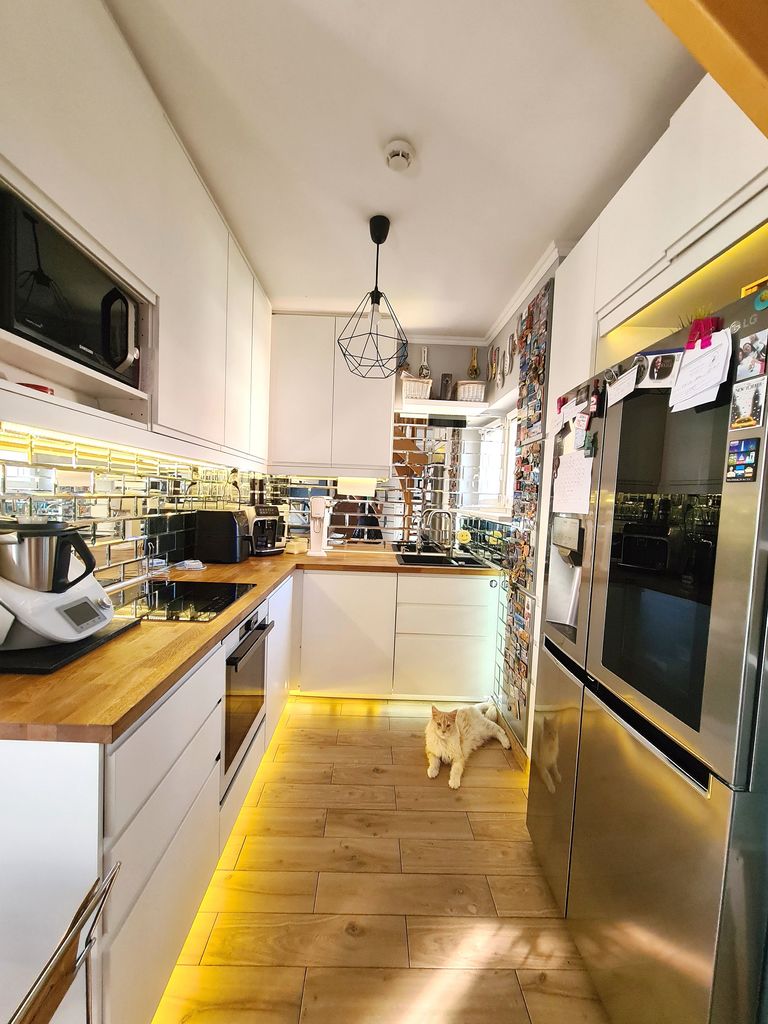 Kuchnia w stałej zabudowie w kolorze białym, z eleganckimi lustrzanymi płytkami wraz z markowym sprzętem AGD: