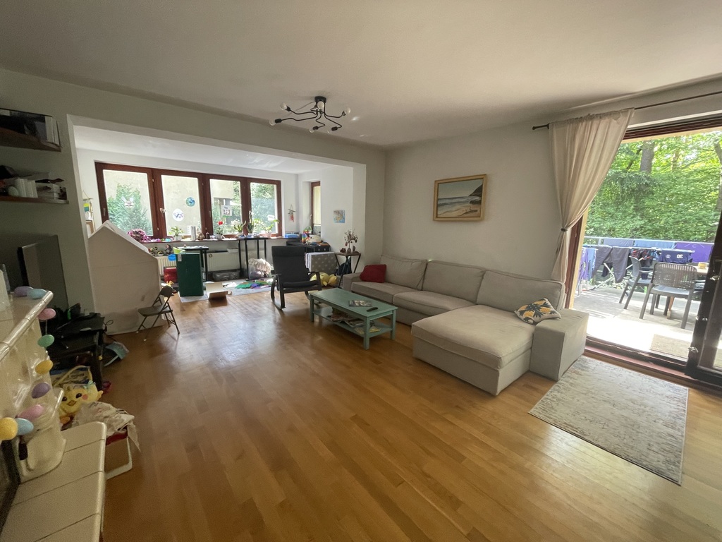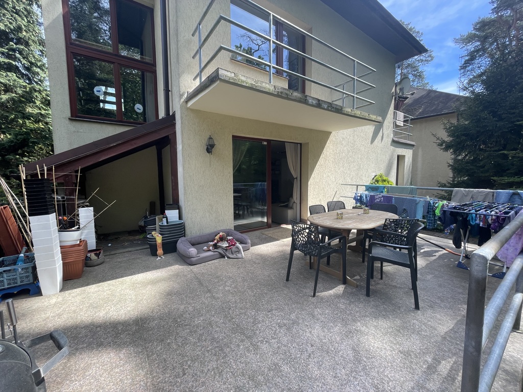 - salonu z kominkiem oraz wyjściem na granitowy taras i zejściem do ogrodu, za furtką las,
