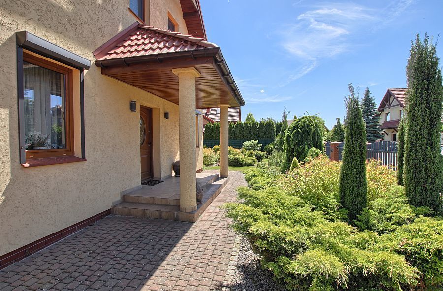 Otoczenie domu pięknie zagospodarowane, podjazd do garażu wyłożony kostką brukową. Posesja ogrodzona .