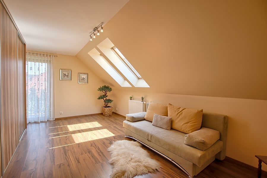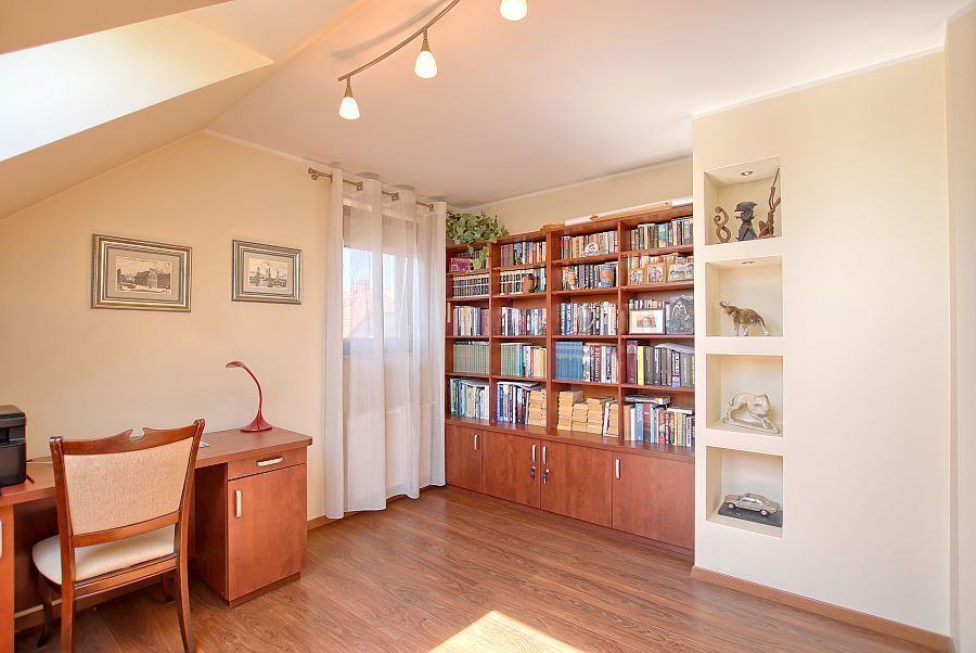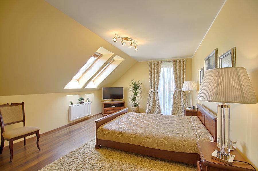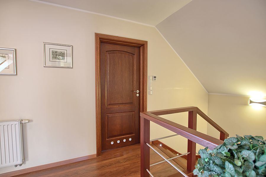 Na tym poziomie znajdują się trzy sypialnie oraz przestronna łazienka z wanną. Dodatkową powierzchnią jest stryszek.