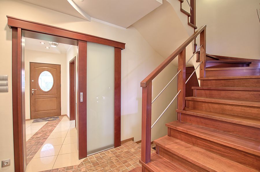 Na górę prowadzą gustowne, drewniane schody.