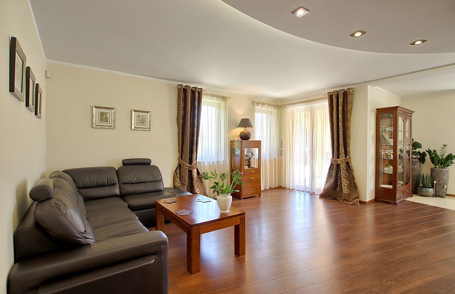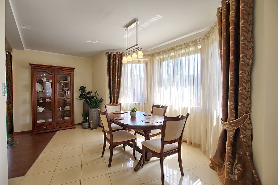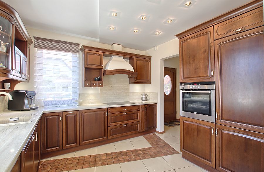 Dom jest wykończony w wysokim standardzie. Kuchnia zabudowana jest drewnianymi meblami na wymiar i wyposażona w sprzęt AGD: płytę elektryczną, piekarnik, lodówkę z zamrażarką, zmywarkę i okap.