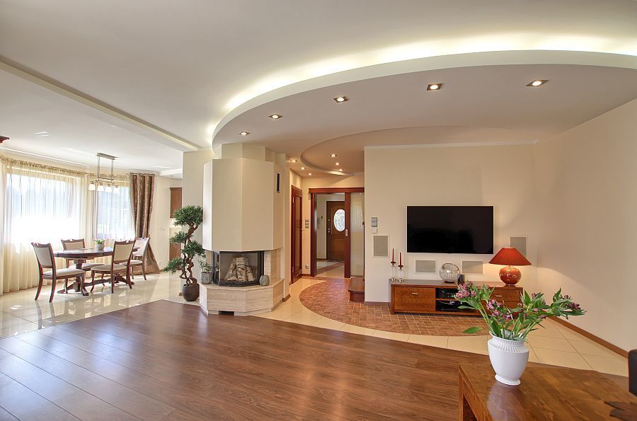 bardzo duży, przestronny, słoneczny salon z kominkiem z wyjściem na duży nasłoneczniony taras.