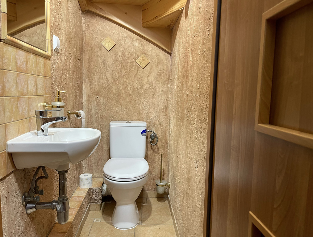 Toaleta pod schodami wyłożona glazurą i terakotą.