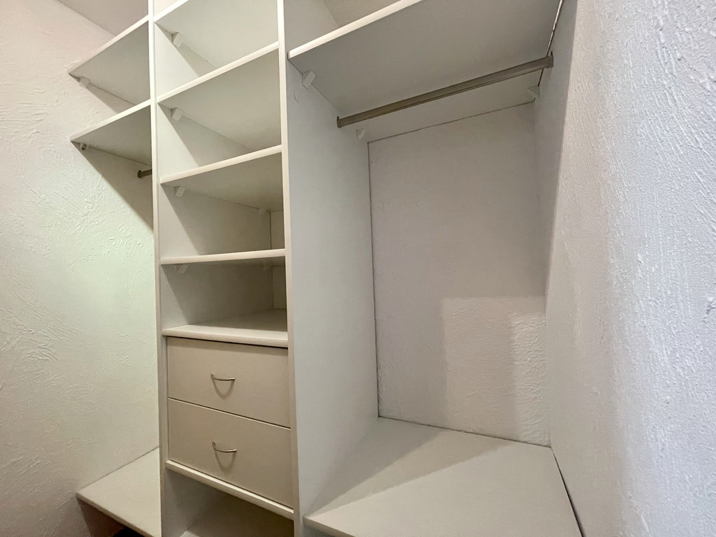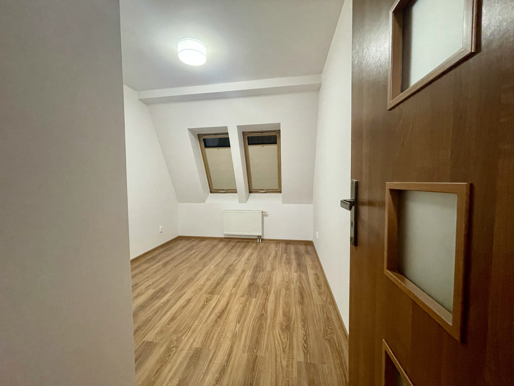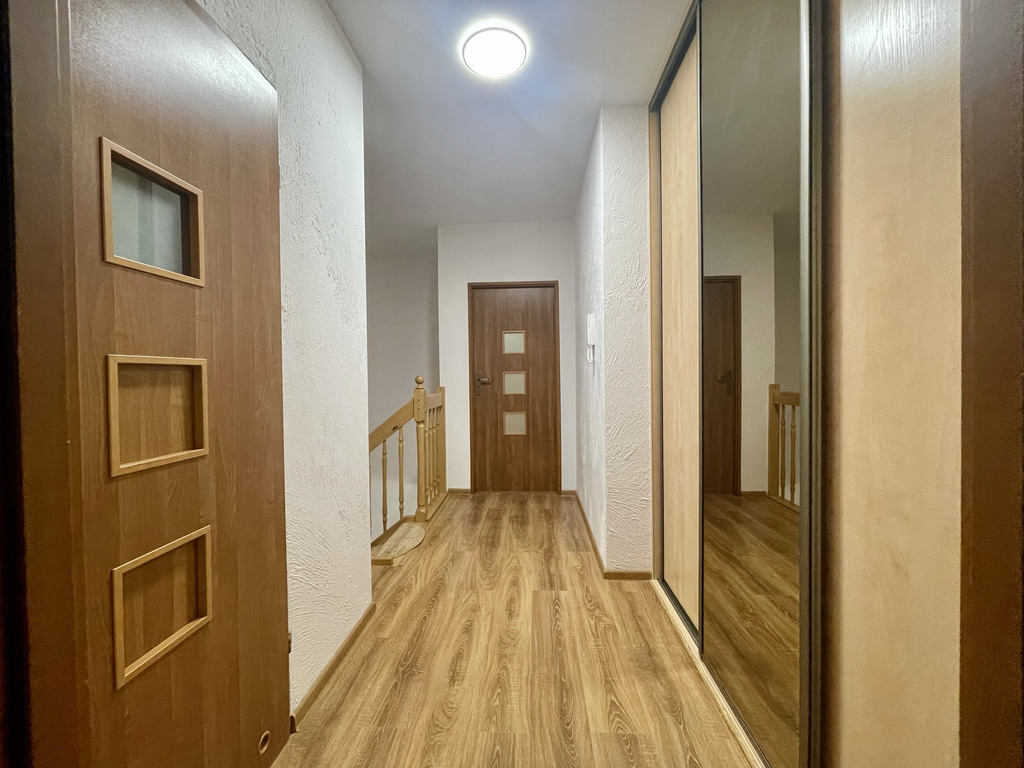 II poziom 2 sypialnie z niewielkimi skosami okna połaciowe, garderoba. całość wyłożona panelami, ściany malowane w białym kolorze.