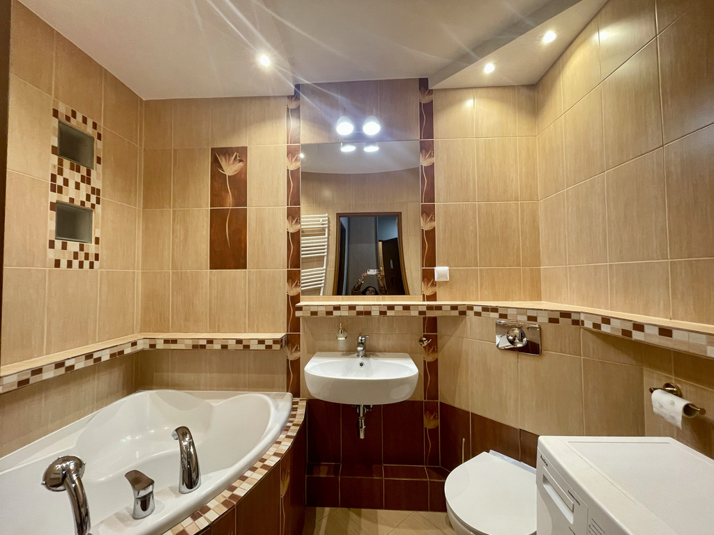 Łazienka z toaletą (glazura, terakota, wanna narożna) wyposażona w pralkę.