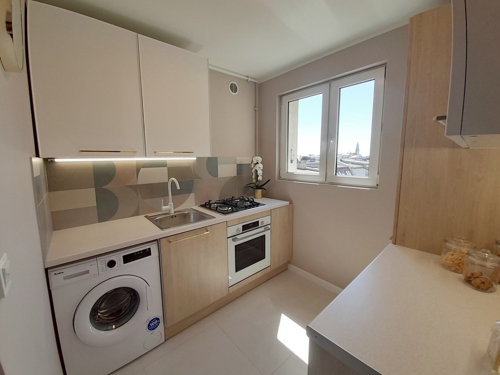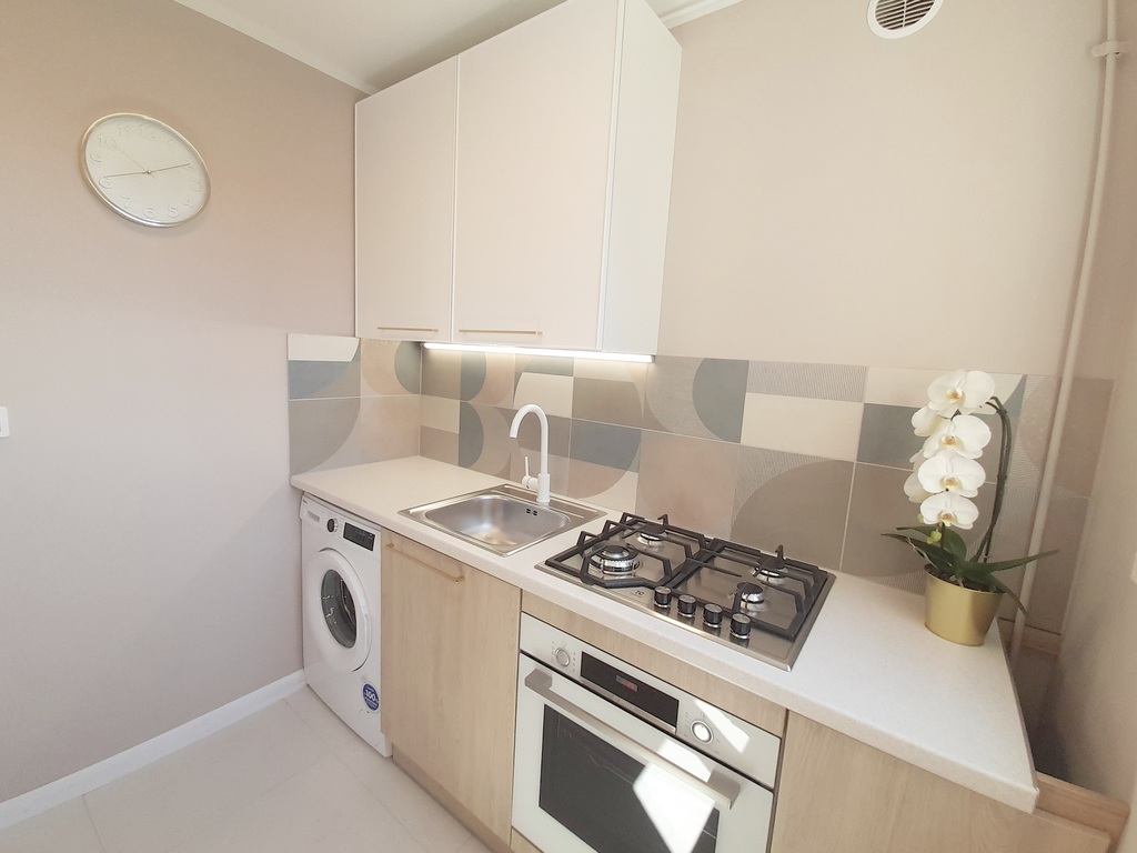 osobna kuchnia z oknem wyposażona w niezbędne nowe meble i sprzęty (takie jak piekarnik z płytą gazową, lodówka z zamrażalką i pralka), łazienka z kabiną prysznicową, umywalką, WC, szafkami i lustrem oraz przedpokój.