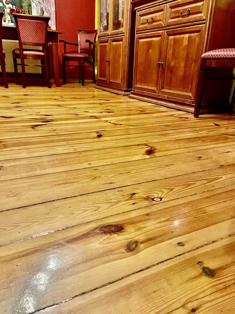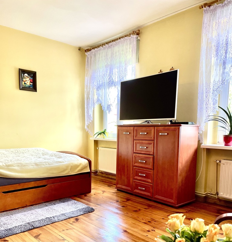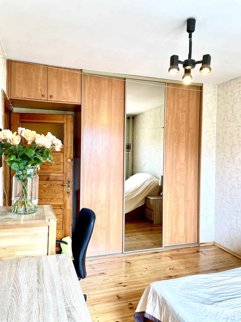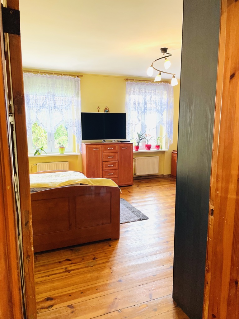 - W pokojach na podłodze pięknie odnowiona deska, dodająca mieszkaniu niepowtarzalnego charakteru. Podobnie jak drzwi i futryny.
