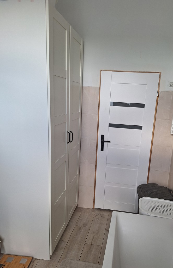 wanną, umywalką, WC, dużą szafą gospodarczą oraz pralko-suszarką o dużym załadunku