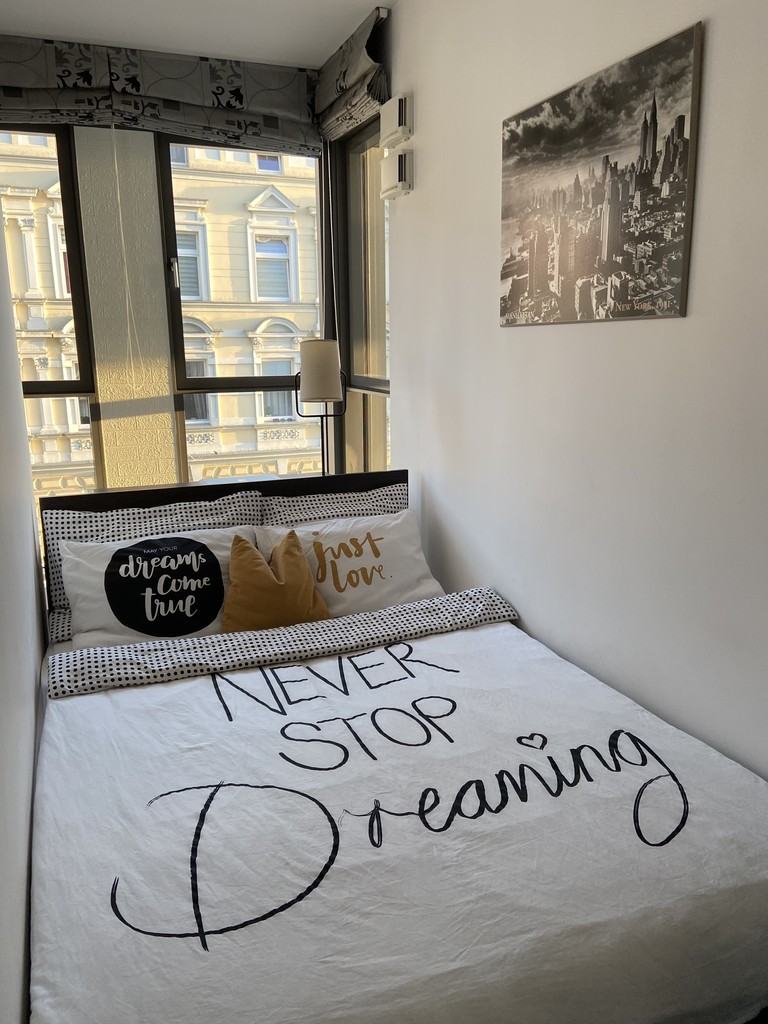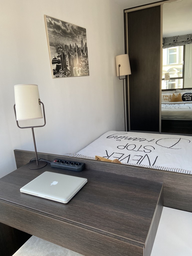 Atutem tej niewielkiej kawalerki jest aneks sypialny, który sprawia odczucie przebywania w osobnym pokoju. Wygodne łóżko 140/200 cm posiada duży pojemnik pod całą jego powierzchnią, co daje dodatkowe miejsce do przechowywania.