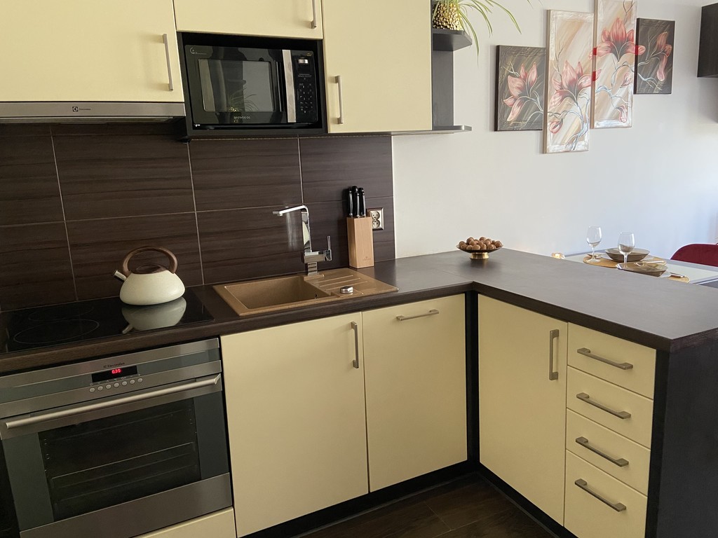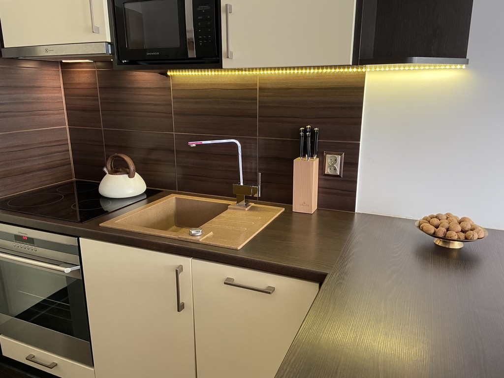 Mieszkanie składa się z pokoju z aneksem kuchennym, w którym została wykonana na wymiar zabudowa wyposażona w niezbędne sprzęty AGD: lodówkę, zamrażarkę, zmywarkę, piekarnik, kuchenkę mikrofalową, płytę indukcyjną oraz okap.