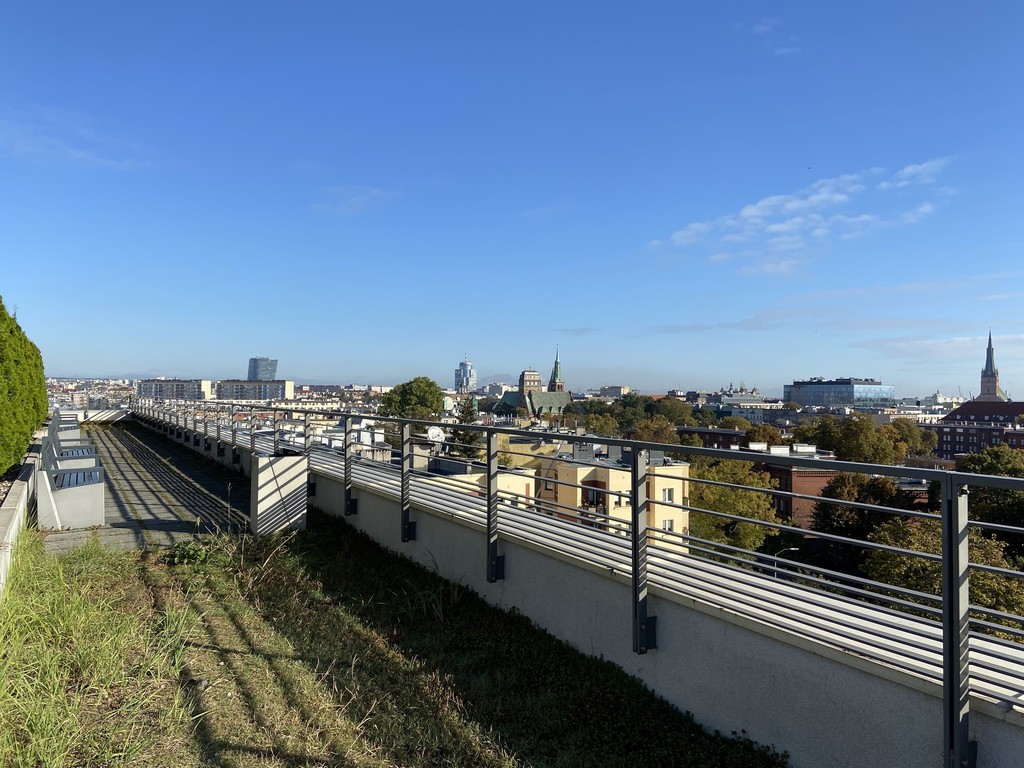 Mieszkanie bardzo jasne z sześciookiennym wykuszem, położone na trzecim piętrze w sześciopiętrowym apartamentowcu. Na dachu budynku duży zielony taras z licznymi nasadzeniami, oświetleniem i częścią wypoczynkową, z którego rozpościera się piękny widok na panoramę miasta. Dostępny jest całą dobę i tylko dla mieszkańców Kamienicy Nova.