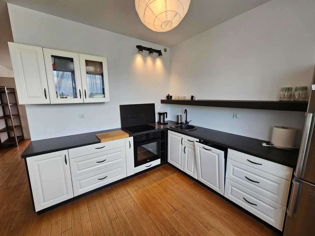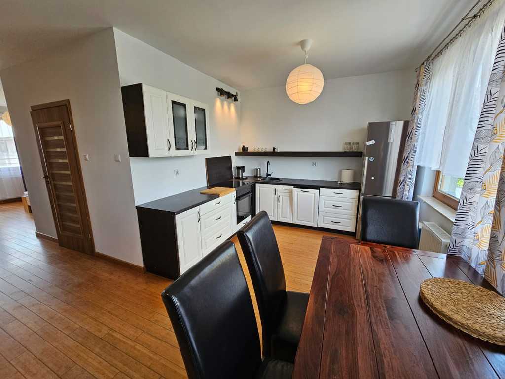 Mieszkanie charakteryzuje otwarty układ pomieszczeń. Pokoje rozkładowe, pokój dzienny połączony z kuchnią, sypialnia od strony południowej z wyjściem na duży taras ok. 12m2. Łazienka w glazurze i terakocie z wanną, umywalką i pralką. Kuchnia w pełni umeblowana, widna z oknem, duży stół jadalny. Na podłodze w mieszkaniu deska daglezja.