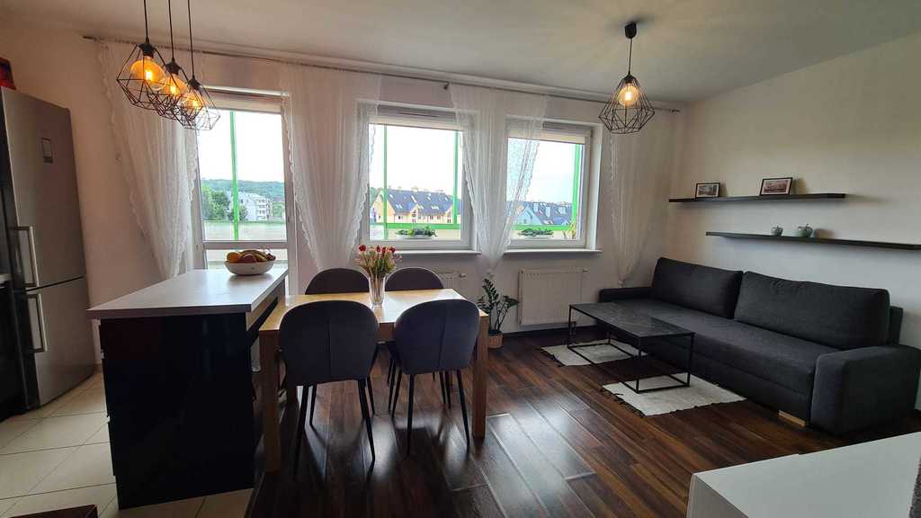 Z salonu wyjście na duży balkon z widokiem na Puszczę Bukową i zieleń.